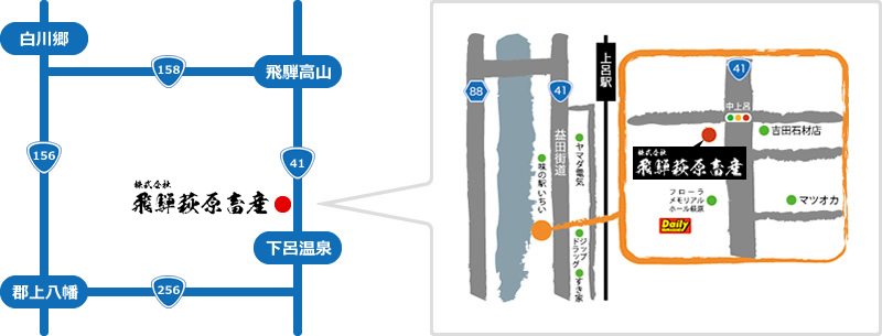 飛騨牛販売専門店「株式会社飛騨萩原畜産」は、天下の三名泉とも称される「下呂温泉」から小京都「飛騨高山」へと飛騨川に沿って続く国道41号線沿いに立地しております。